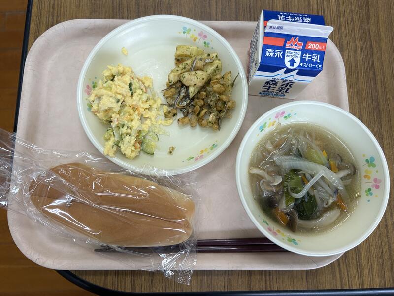 今日の献立は、【牛乳、セルフエッグサンド、中華スープ、青のりポテトビーンズ】です。早いもので、いよいよ11月に突入しました。11月8日が「いい歯の日」であることから、11月の給食には、丈夫で強い歯を作るための「かみかみメニュー」がいくつか出てくるそうです。今日の「青のりポテトビーンズ」も、かみかみメニューでした。大豆やいりこなどが入っており、噛み応えが抜群でした。味も、もちろんとても美味しかったです。今日も美味しい給食に感謝・感謝です。