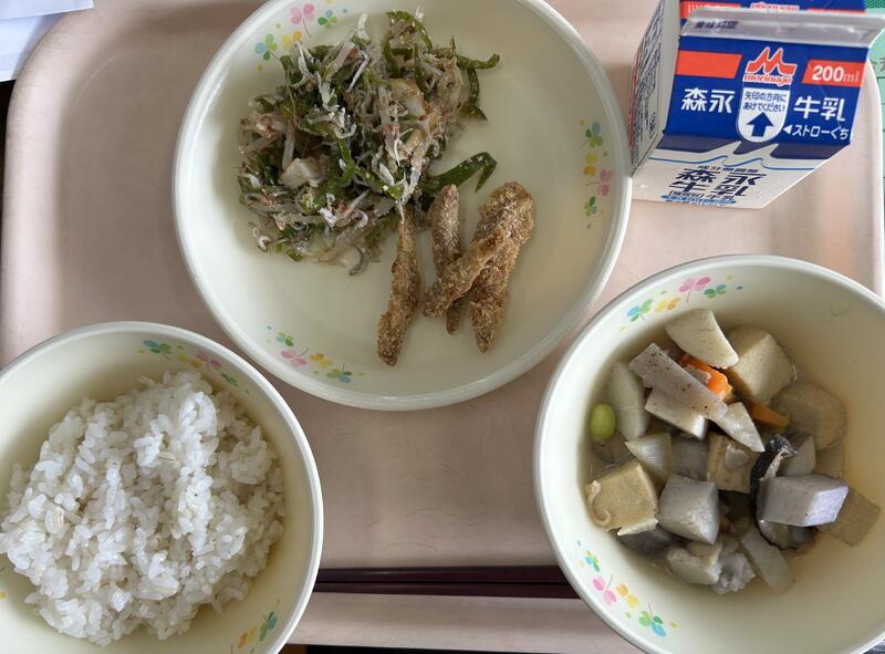 今日の献立は、【牛乳、麦ご飯、里芋の煮物、いわしの梅から揚げ、ピーマンのじゃこ和え】です。今日の注目食材は「いわし」です。いわしは、めざし、煮干し、ちりめんじゃこ、アンチョビなど・・・色々な姿で私たちの食卓に出てきます。骨や皮に固さがないため、子どもでも食べやすく、なおかつ栄養満点な本当にありがたい食材です。今日の給食には、「いわしの梅から揚げ」「ピーマンのじゃこ和え」の2品にいわしが出てきました。どちらのメニューもいわしの風味が豊かで、どんどん食が進んでいくような美味しさでした。今日も美味しい給食に感謝・感謝です。