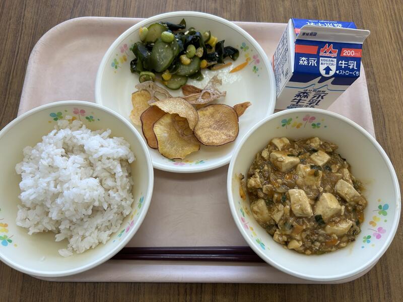 今日の献立は【牛乳、むぎご飯、切り干しのごま和え、ナッツのかりんとう、スタミナ麻婆】です。