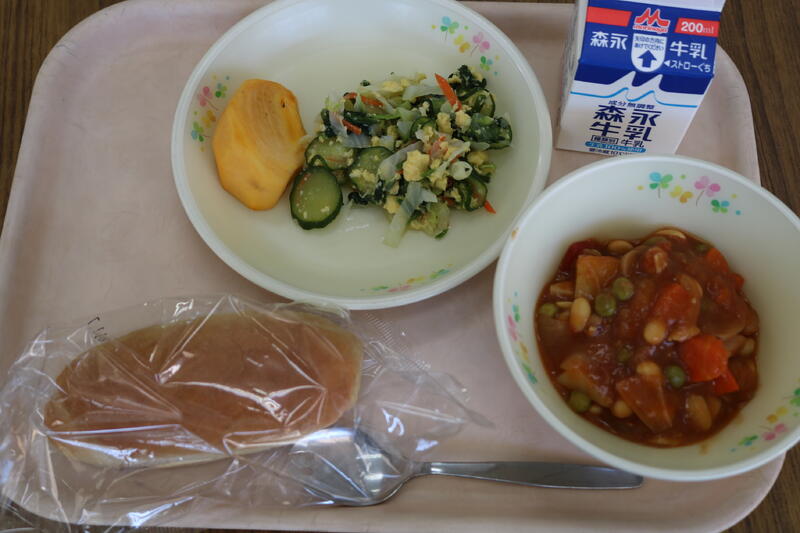 今日の献立は、【牛乳、玄米パン、チキンビーンズ、ほうれん草とたまごのサラダ、柿】です。10月末の本ブログで、「11月には甲佐町の柿が出てくるので楽しみです」と書かせてもらいましたが、本日、待ちに待った甲佐町産の柿が出てきました!今日の給食に出てきた柿は、宮内地区で作られている「太秋柿(たいしゅうがき)」という品種だそうです。とても甘く、みずみずしく、食べていて幸せを感じるような味わいでした。今年は、猛暑とカメムシの影響で、全国的に柿が不作だそうです。そのような中でも、給食でこんなに美味しい柿が食べられて、とてもありがたく感じました。今日も美味しい給食に感謝・感謝です。