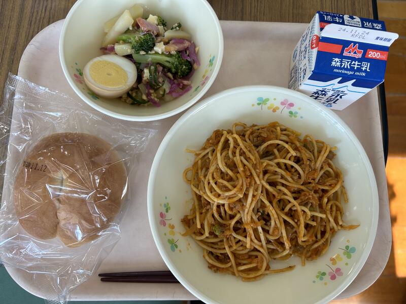 今日の献立は、【牛乳、米粉パン、スパゲッティ・アッラ・ボロネーゼ、具だくさんおかずサラダ、ゆで卵】です。今週はおはなし給食ということで、色々な物語に出てくる料理が給食として出てきています。今日は、「こまったさんのサラダ」と「こまったさんのスパゲティ」にちなんだメニューが出てきました。とても豪華な給食だったので、職員室内では「ホテルの料理みたいだね」といった声が聞こえてきました。味は、もちろん美味しかったです。お腹いっぱい・幸せいっぱいになるような味わいでした。今日も美味しい給食に感謝・感謝です。