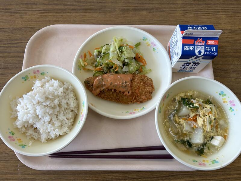 今日の献立は、【牛乳、麦ご飯、魚の野菜あんかけ、おろし汁、じゃがいものごまネーズあえ】です。今日の注目メニューは「魚の野菜あんかけ」です。たまねぎ、ピーマン、にんじんが入った栄養満点のあんが、カリッと揚げられた魚の上にかかっていました。今日使用されていた魚の正体は「サバ」でした。サバのジューシーさと、野菜のあんのサッパリ加減が絶妙にマッチしていて、とても美味しくいただきました。昼夜の寒暖差が激しくなってきていますが、栄養満点の給食をたくさん食べて、体調管理に気をつけていきたいです。今日も美味しい給食に感謝・感謝です。