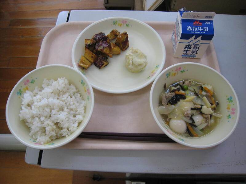 今日の給食の献立は、【牛乳・セルフ中華丼・豆腐しゅうまい・大学芋】です。