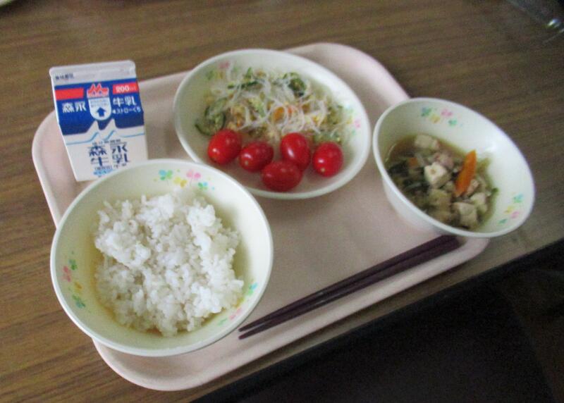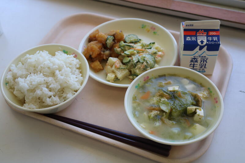 正解は3の日本でした。ひっかけは1のメキシコです。メキシコには「タコス」という料理があります。そのタコスをご飯と一緒に食べるという全く新しい味として沖縄で誕生したのが、タコライスです。スパイシーに味付けした挽肉、トマト、キャベツ、玉ねぎ、チーズで味付けしてあり、ピリッとした辛さを楽しむことができました。もずくスープは、豆腐、えのき、ちんげん菜、人参が入っていました。もずくと言えば、やはり沖縄です。もずくはツルツルッとしたのどごしでミネラルが豊富です。タコスやもずくを食べて暑い夏をのりきろう!今日も美味しい給食に感謝・感謝です。