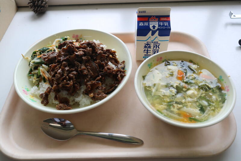 ビビンバは韓国料理ですが、ビビンバのビビンは「混ぜ」、バは、「ごはん」を意味します。ナムルは、野菜や山菜などをゆでて、ごま油や塩、にんにく等で味付けした料理です。写真からもわかるように、たっぷりの牛肉とナムルが「混ざった」料理です。ちょっとピリッとしたのは、恐らくコチュジャンではないでしょうか? 牛肉、しいたけ、しょうが等で甘辛く味付けがしてあり、「ご飯が何杯でもいける!」 職員室では、このビビンバに舌鼓(したつづみ)を打ちながら食べました。美味しい給食に今日も感謝・感謝です。