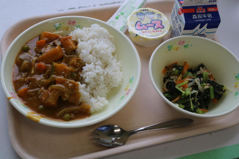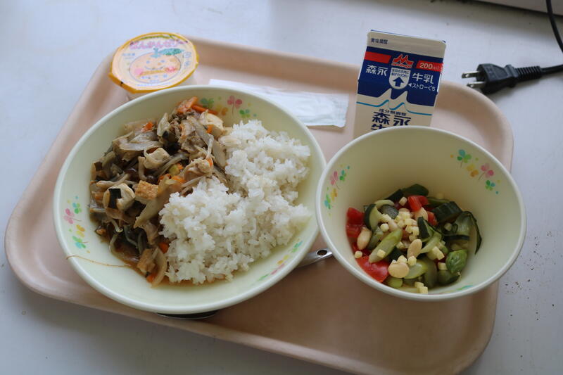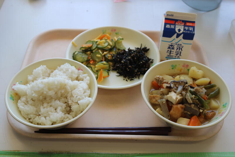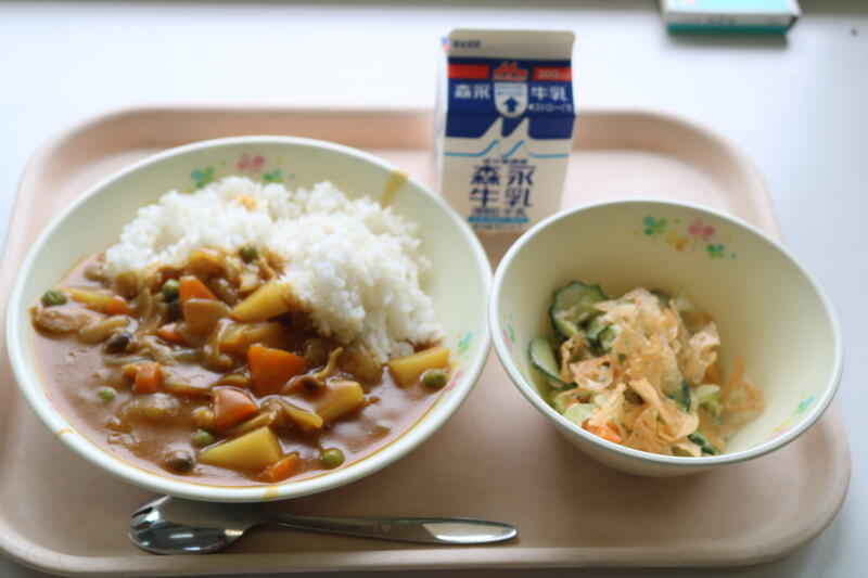 今日の献立は【牛乳、ドライカレーライス、じゃこサラダ、ヨーグルト】でした。1年生で「おかわりしたい人?」と担任が聞いたら、「は~い!」と全員が手を挙げたということで、やはり、カレーは大人気だなと思いました。今日のドライカレーには、豚肉、なす、ピーマン、人参、ごぼう、まめ、じゃがいもが入っていました。夏野菜のなすやピーマン、珍しい食材ではごぼうが入っていたのには驚きでした。また、じゃこサラダには、カシューナッツも入っていて、ちりめんの柔らかさとナッツの歯ごたえの両方が楽しめて美味しかったです。今日も美味しい給食に感謝・感謝です。