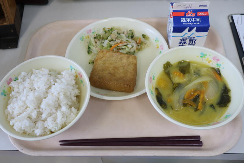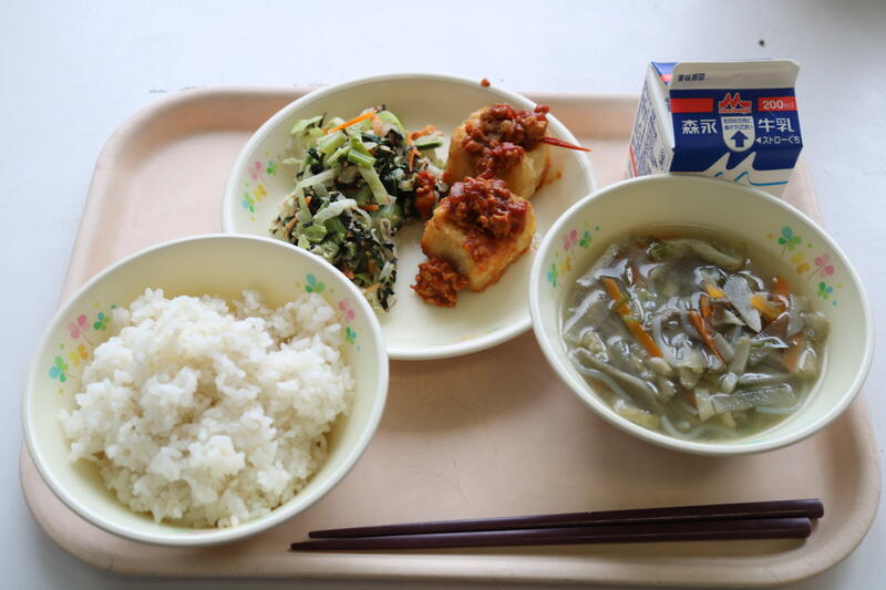 今日の献立は【牛乳、麦ご飯、味噌汁、しのだに、ゴーヤのツナ和え】でした。今日の主役は、「しのだに」です。漢字で「信田煮」と書くそうです。関西では油揚げのこと信田と呼ぶことからこの料理名がつけられたそうです。今日の信田煮には、油揚げの中に挽肉やにんじんが入っていました。噛んだ瞬間に出汁がジュワッと出てきて、口の中に幸せを感じるような美味しさでした。職員室内でも「出汁が染み込んでいて美味しい!」「家でも出したい!どこかに売ってないかな~」といった声が出ていました。今日も美味しい給食に感謝・感謝です。