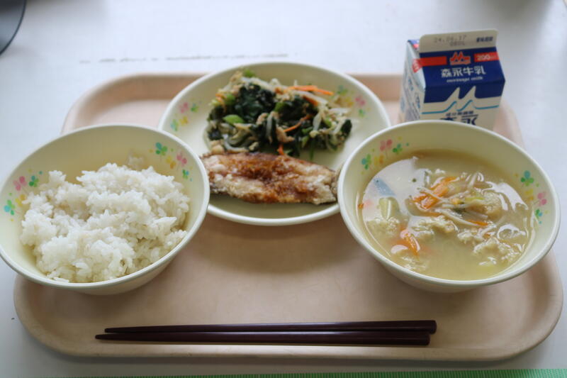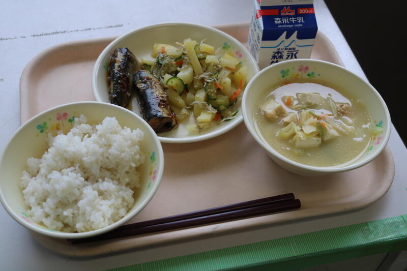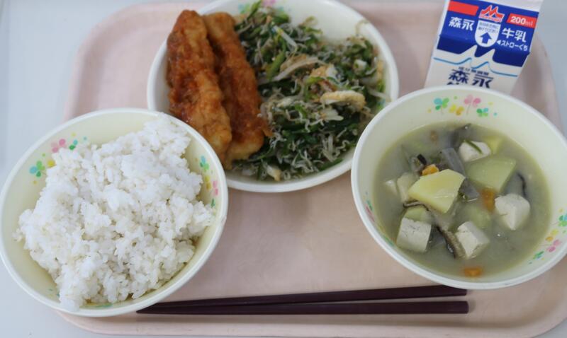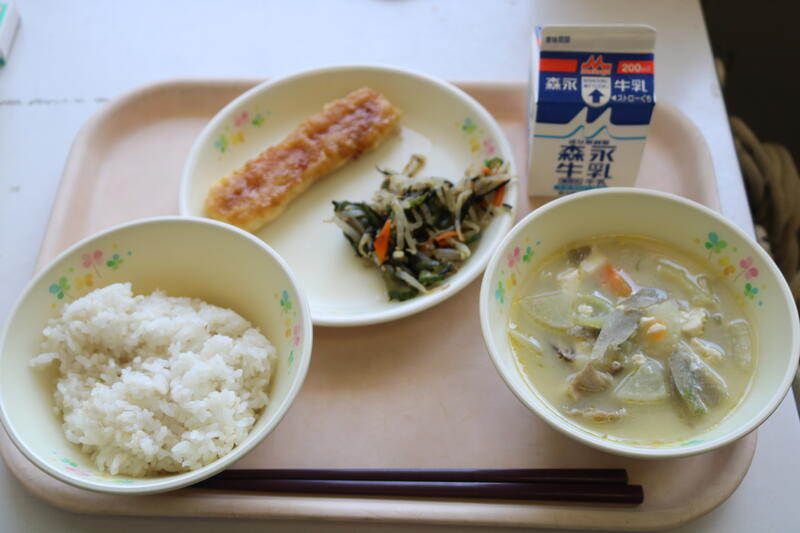 今日の献立は【牛乳、むぎご飯、みそ汁、いわしの生姜煮、じゃこじゃがサラダ】です。いわしの生姜煮は、身の詰まった「いわし」に生姜ベースのタレが絡んでおり、まさに【ご飯のお供】という表現が合うような美味しさでした。じゃこじゃがサラダは、一口大にカットされたジャガイモに加え、たくさん入っていた「じゃこ」が風味を引き出していたため、とても食べ応えがありました。具だくさんの味噌汁にはダシに「いりこ」が使われていました。身も心も温かくなるような優しい味でとても美味しかったです。今日も美味しい給食に感謝・感謝です。