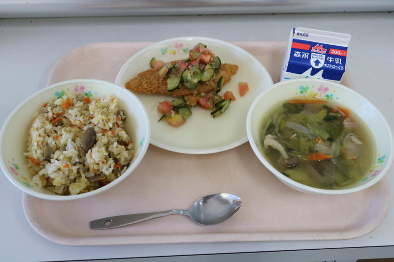 今日の献立は【ご飯、鶏ゴボウピラフ、魚のラビゴットソース、野菜のスープ】です。今日の主役は「魚のラビゴットソース」。ラビゴットソースって何?と思って調べてみるとフランス語の動詞 ravigoter「元気を出させる」に由来しているそうです。酢と野菜のみじん切りをベースとしたソースで、今日は、トマト、キュウリ、玉ねぎのみじん切りでした。やはり、酢の風味が効いていて「元気がでる!」という感じでしたが、白身魚のフライの上にかかっていると、サクッとした食感に酢の酸味がマッチしていて、あっさり、美味しく食べられました。今日も美味しい給食に感謝・感謝です。