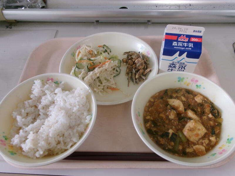 今日の献立は【牛乳、むぎご飯、切り干しのごま和え、ナッツのかりんとう、スタミナ麻婆】です。
