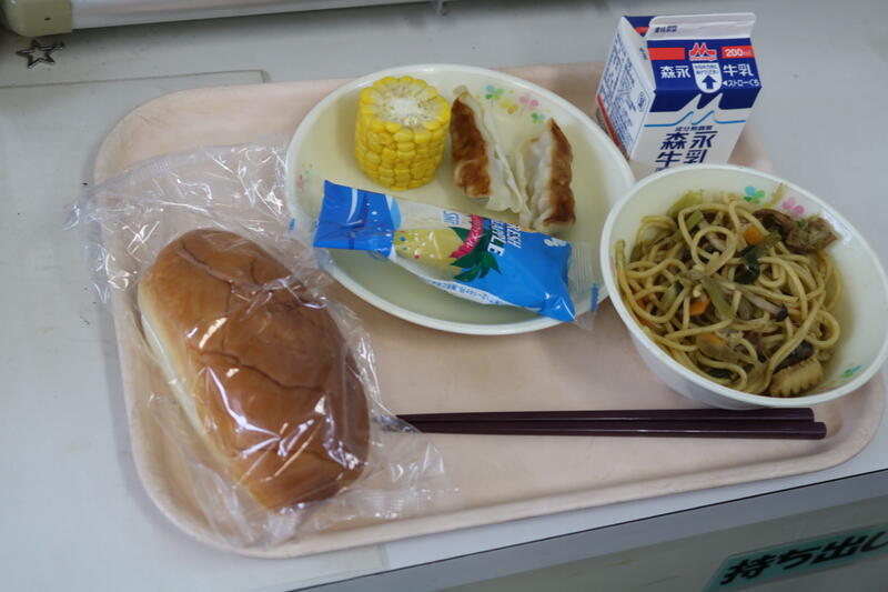 本日の献立は【牛乳、ミルクパン、焼きそば、餃子、ゆでトウモロコシ、冷凍パイン】でした。今日は、給食前から「焼きそばが待ち遠しい~」と言う声が教室であがっていました。焼きそばには、豚肉、イカ、しめじ、てんぷら(魚肉)、キャベツ、人参、もやし等が入っていて、濃いソースと麺がよくからまってとっても美味しくいただきました。また、子供たちはデザートの冷凍パインも楽しみにしていたみたいで、教室や廊下から「今日は、冷凍パインだ~」という声も聞こえてきました。今日も美味しい給食に感謝・感謝です。