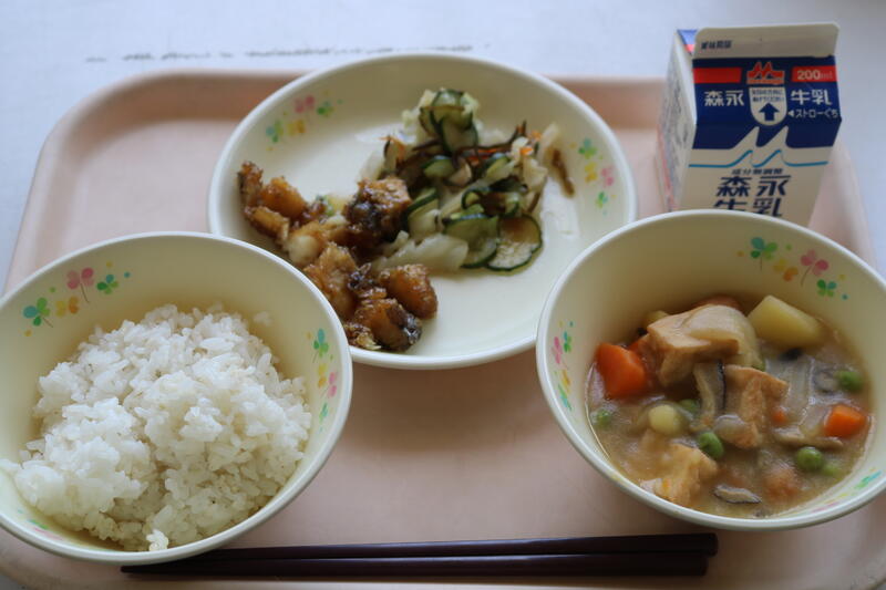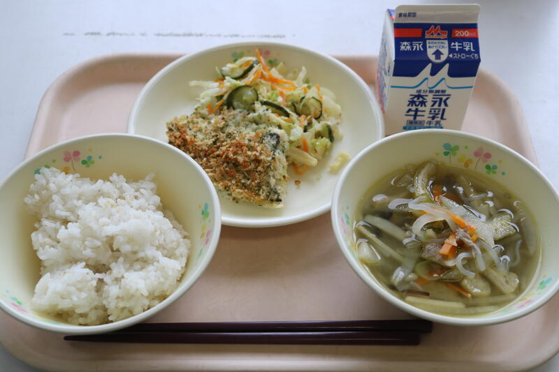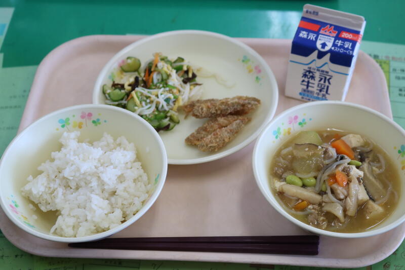 今日の献立は【牛乳、麦ご飯、豚汁、イカのチリソース、ピーマンのじゃこ和え】でした。今日の給食の主役は、「ピーマンのじゃこ和え」です!夏野菜でもあるピーマンがたくさん入っていました。今日のピーマンは、苦みが少なく、子どもでも食べやすいのではないかと感じました。そして、もう一つの注目が「じゃこ」です。ピーマン同様、たくさん入っていて、噛み応えが抜群でした。じゃこにはカルシウム、ビタミンDなどの栄養が豊富に含まれていると言われています。特にカルシウムについては、100gあたりに約2,200mg含まれており、これは200mlの牛乳10本分に相当するそうです。風味も豊かでとても美味しかったです。今日も美味しい給食に感謝・感謝です。