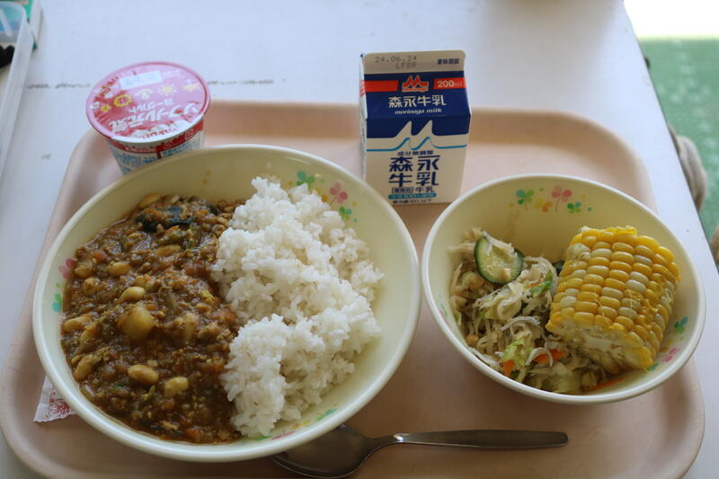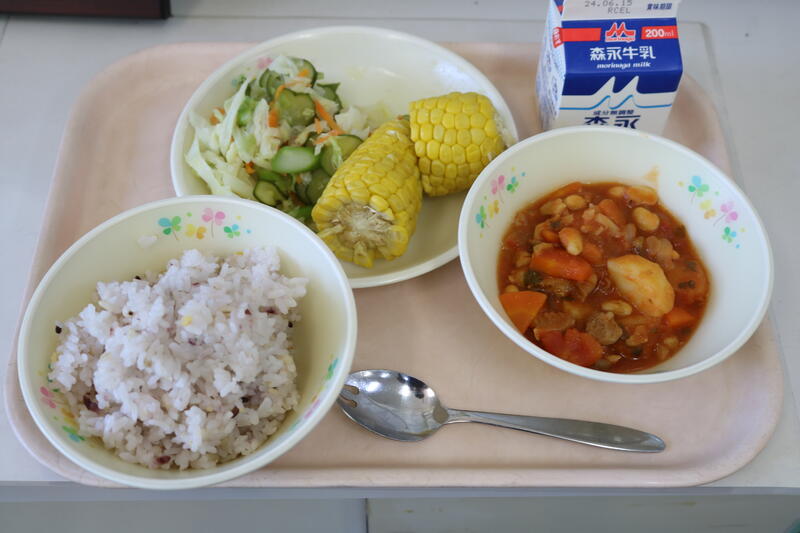 今日の献立は【牛乳、雑穀ご飯、鶏肉と豆のトマト煮、ゆでトウモロコシ、グリーンサラダ】です。雑穀米は栄養と美味しさの二刀流です。ちなみに今日の雑穀ご飯には、「米、むぎ、ひえ、アマランサスと4種類の雑穀が入っていました。雑穀には、食物繊維が豊富で、腸内環境が改善され、便秘を解消したり、身体全体の代謝を上げる効果があるそうです。鶏肉と豆のトマト煮は、鶏肉、大豆、じゃがいも、玉ねぎ、人参、キャベツ、パセリなどが入っていました。トマトも栄養価が高くリコピンやベータカロテンを多く含んでいます。そう考えると、美味しくて栄養をしっかり考えて作ってある給食からは、この夏を乗り切るパワーをもらっていると思います。今日も美味しい給食に感謝・感謝です。