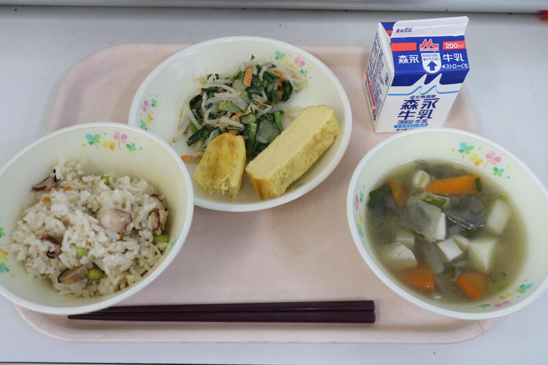 今日の献立は【牛乳、たこ飯、卵焼き、けんちん汁、ごま酢あえ】でした。今日の主役は何と言っても「たこ飯」です。実は今、このたこの値段がとても高いのをご存知ですか? 家庭用でたこ焼きをしようとしてもスーパーで1パックに足2本ぐらい入っていて700円~800円という値段に目が飛び出ていました。今日のたこ飯には、たこ、しいたけ、えだ豆、人参が入っていましたが、たこを噛んだ時のかつおや昆布でとった出汁の美味しさを感じてとっても美味しかったです。普段はまず食べない「たこ飯」。しっかり噛みしめて歯ごたえと味を楽しみました。今日もおいしい給食に感謝・感謝です。