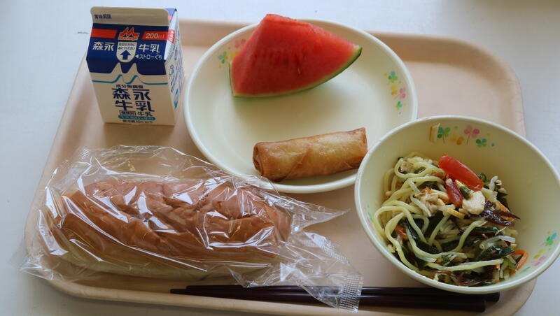 今日の献立は【牛乳、ミルクパン、冷やし中華、春巻き、スイカ】でした。今日の主役は、やはり「冷やし中華」ですね。今年もついに始まりました!暑い日の冷やし中華は、体の中まで染み渡るような美味しさで、あっという間に食べきってしまいました。トマト、わかめ、キュウリ等、栄養いっぱいの食材も入っており、本当にありがたいメニューでした。今日はデザートに「スイカ」もありました。とても甘く、みずみずしく、美味しくいただきました。冷やし中華とスイカを食べていると、小学生の頃の夏休みを思い出し、とても懐かしい気持ちになりました・・・。今日も美味しい給食に感謝・感謝です。