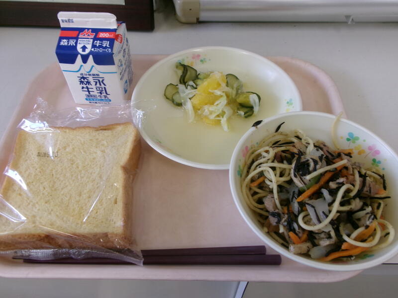 今日の献立は、【牛乳、かぼちゃパン、ひじきスパゲッティ、甘夏サラダ】でした。ひじきスパゲッティには、ひじき、油あげ、玉ねぎ、人参、天ぷら、ベーコン、しめじ、ピーマンが入っていました。ひじきには、お腹の調子を整える「食物繊維」、貧血を予防する「鉄分」、骨や歯をつくる「カルシウム」などが含まれています。まさに栄養たっぷりです。野菜もたっぷり入っていましたが、ベーコンや油あげなどもパンチが効いていて、いろんな味を楽しめて美味しかったです。甘夏サラダは、甘夏の甘酸っぱさとキュウリやキャベツのシャリシャリした食感を楽しむことができました。今日も美味しい給食に感謝・感謝です。
