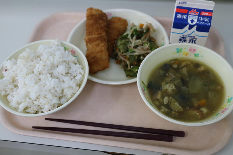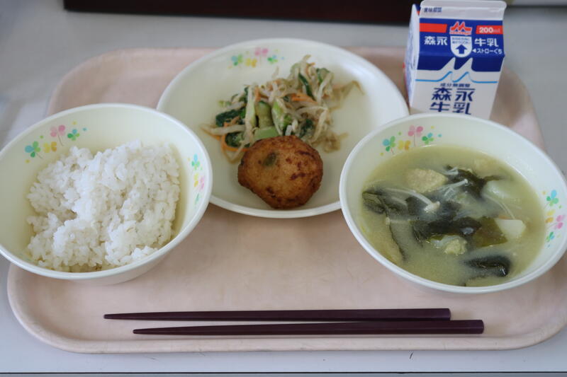 今日の献立は【牛乳、むぎご飯、手作りさつま揚げ、みそ汁、ごま和え】でした。今日の主役は何と言っても「手作りさつま揚げ」です。肉厚で噛んでみると中には、枝豆、大豆、チーズなどが入っていました。ちょっとお醤油とかつけたら、ご飯がとまらなくなる一品です。みそ汁には、わかめ、えのき、あげ、じゃがいも、玉ねぎ等たくさんの具材が入っていて、白味噌の上品な味がそれぞれの具材を引き立てていて、とても美味しかったです。今日も美味しい給食に感謝・感謝です。