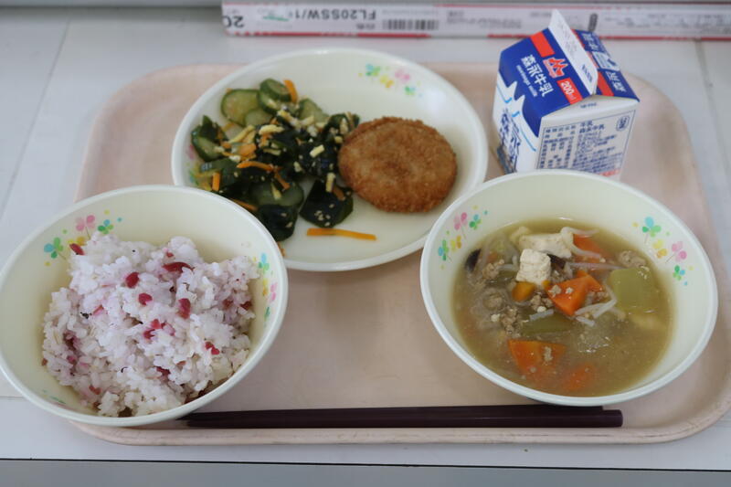 今日の献立は【牛乳、カリカリ梅ご飯、レンコンのはさみ揚げ、冬瓜のそぼろ煮、酢の物】でした。カリカリ梅ご飯は、さわやかな梅の酸味とほんのりとした甘さのバランスが食欲をそそり、ごはんが進みました。冬瓜のそぼろ煮の主役はもちろん、冬瓜。冬瓜は今が旬の食べ物なのに何で「冬」と思ったら、職員室の同僚から、「夏の食べ物だけど、冬まで食べられるから冬瓜じゃない?」と教えてもらい、調べたら全くその通りでした。食感はまさに大根だけど、ちょっと緑がかった大根という感じでした。そら豆や厚揚げ、人参、しらたき、ひき肉、しいたけとたくさんの具材が入っていてとても美味しかったです。レンコンのはさみ揚げは「文句なしで美味い!」今日も美味しい給食に感謝・感謝です。