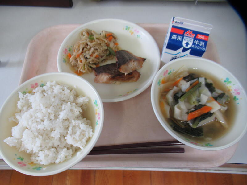 今日の献立は【牛乳、麦ご飯、魚の照り焼き、きしめん汁、切り干し大根のチャプチェ】でした。今日はチャプチェを紹介します。チャプチェは、韓国の春雨を使った料理です。今日は、春雨の代わりに切り干し大根が使われていました。豚肉、ピーマン、人参、ごま等が入っていて、ご飯の上にかけたら、ご飯がとまらない一品でした。「家でもつくってみようかな!」という声が出ていました。きしめん汁は、キャベツ、小松菜、かまぼこ、しいたけ、人参が入っていました。きしめんなので、平べったい麺ですが、出汁がしっかりとからんでとても美味しかったです。魚の照り焼きは、「めばる」でした。香ばしく、しょうゆ、みりんの味付けでとても美味しかったです。今日も美味しい給食に感謝・感謝です。