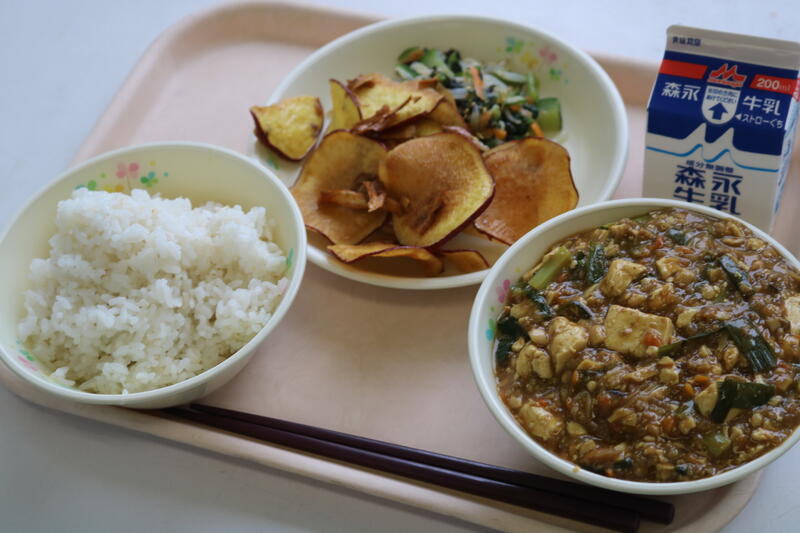 今日の献立は【牛乳、麦ご飯、カレー豆腐、ナムル、根菜チップス】でした。今日は出張で不在の職員が数名いたので、いつもより盛り盛りでいただきました。今日の主役は、カレー豆腐です。私にとっては人生初めてのメニューでした。そのため、午前中は、まだ見ぬカレー豆腐の姿にワクワク・ドキドキしておりました。給食の時間になり、いざ食缶を開けると、カレーの匂いが一気に吹き出し、食欲がそそられるような感覚でした。見た目は麻婆豆腐に近いですが、カレーの風味がしっかりしており、具材にも味が染みていて、一気に完食してしまいました。また、小さいおかずの根菜チップスにはさつまいもとゴボウが使用されており、噛み応え抜群で美味しくいただきました。今日も美味しい給食に感謝・感謝です。