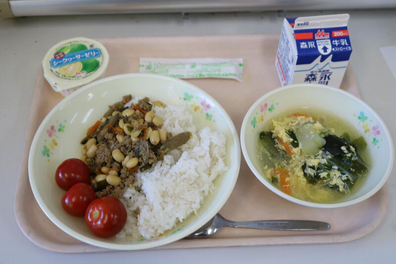 今日の給食は、【牛乳、ソイ丼、卵スープ、ミニトマト、シークヮーサーゼリー】でした。今日の主役は何と言ってもソイ丼。ソイは大豆で、ソイ丼の具には、たくさんの大豆とひき肉、ごぼう、人参、ニラなどが入っていました。味の決め手のソースは何だろう?、BBQソースでもない、照り焼きソースでもない、でもカレー風味で、ご飯がとまらないこのソースの正体は?? 職員室では、「ターメリックだ!」という結論になりましたが、どうでしょうか?当たっていますか? 今日も美味しい給食に感謝・感謝です。