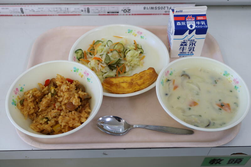 今日の献立は【牛乳、ジャンバラヤ、オムレツ、クリームスープ、グリーンサラダ】でした。クイズです。ジャンバラヤってどこの国の食べ物だと思いますか?