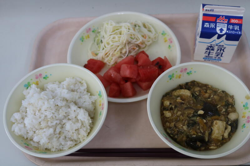 今日の献立は【牛乳、麦ご飯、麻婆なす、ビーフンサラダ、スイカ】でした。本日の注目メニューは「スイカ」です。今日のスイカは、細かくサイコロ状にカットされていて、子どもたちにも食べやすいようになっていました。調理員の皆様の一手間が本当にありがたいです。味はもちろん、とても美味しかったです!スイカのみずみずしさが体の中まで染み渡るようでした。水分が豊富に含まれているスイカには、夏バテに効果的なビタミンB1・B2・Cなどのビタミン類も含まれているそうで、この季節には本当にありがたい食材ですね。今日も美味しい給食に感謝・感謝です。