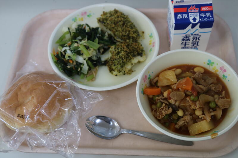 今日の献立は【牛乳、米粉パン、ポークビーンズ、魚の香草焼き、小松菜のサラダ】でした。今日の主役は「魚の香草焼き」です。魚の上に、パン粉、バジル、チーズなどを混ぜたものを乗せて焼いてありました。パン粉のサクッとした食感がクセになり、思わず口いっぱいに頬張ってしまいました。また、バジルの風味とチーズの香ばしさが絶妙にマッチしており、とても美味しくいただきました。ちなみに、今日使用されていた魚の正体は「ホキ」でした。ホキは水深300~800mあたりに生息している深海魚だそうです。あまり馴染みがないように思われていますが、お弁当に入ってる白身魚フライ、フィッシュバーガー、ちくわなどに広く使用されているそうです。今日も美味しい給食に感謝・感謝です。