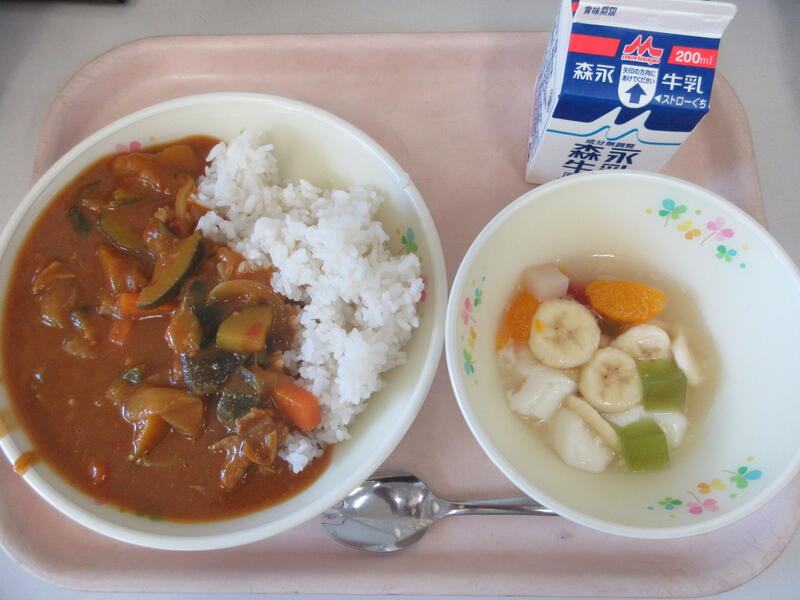 今日の献立は【牛乳、麦ご飯、夏野菜カレー、杏仁フルーツ】でした。今日は、いよいよ1学期最後の給食でした。最後は、みんな大好きなカレーライスが出てきました!今日は「夏野菜カレー」ということで、カボチャ、トマト、ナスなどなど...たくさんの夏野菜が入っていました。夏野菜の甘みのおかげで、あまり辛すぎず、素材本来の味を感じながら美味しく食べることができました。デザートの杏仁フルーツには、たくさんのフルーツと程よい甘みの杏仁豆腐・ゼリーが入っており、辛みが残った口に優しい味わいで、とても美味しくいただきました。明日から夏休みです。夏休み中は、美味しい給食が食べられず、少し寂しいですが、しっかり栄養管理に気を付けて、2学期も美味しく給食が食べられるようにしていきたいですね。1学期中の美味しい給食に心から感謝・感謝です。