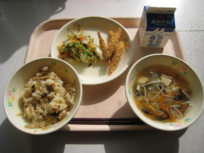今日の給食の献立は、【牛乳・麦ご飯・大豆と豆腐のフライ・豚汁・ごまあえ】です。12月に入り、今年も残り少なくなってきました。今朝は、朝から出勤しようと車に乗り、ワイパーをかけたら、『ザッーザー』と凍っていました。そして、車の外気温計を見ると1℃でした。すっかり冬らしくなってきました。