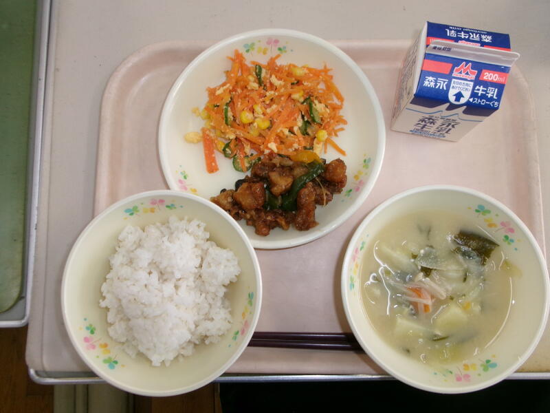 今日の給食の献立は【牛乳・麦ごはん・南関揚げの卵とじ・磯香あえ・梨】です。南関揚げは私も大好きな食材の一つです。(家庭でもよく使ってもらいます。)