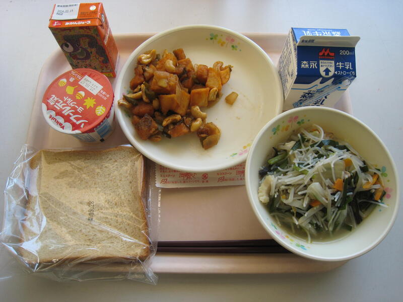 今日に給食の献立は【牛乳・黒糖パン・魚のカシューナッツ炒め・汁ビーフン・ヨーグルト・みかん果汁】でした。