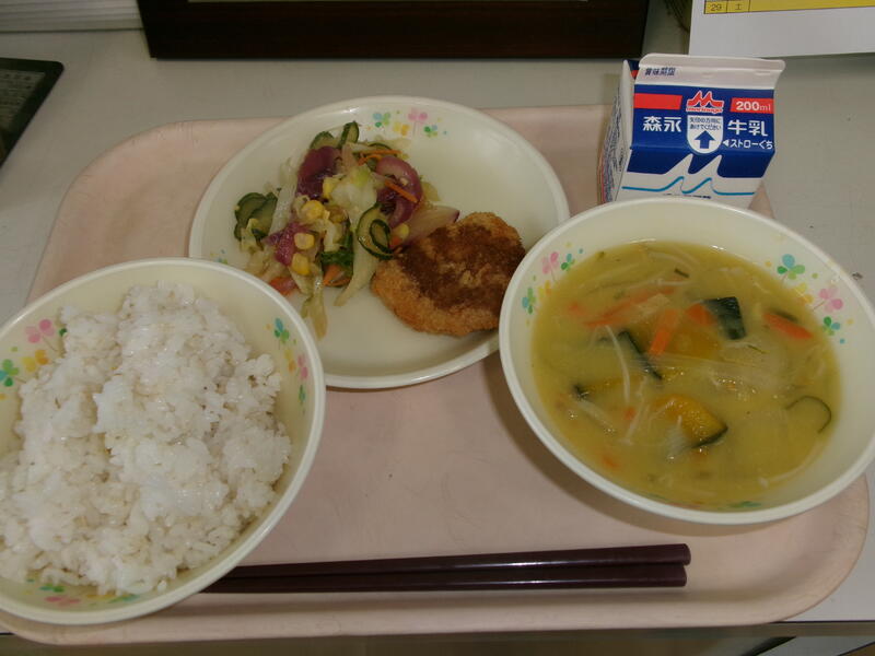 今日の献立は【牛乳、むぎご飯、ソースかつ、みそ汁、紫玉ねぎのサラダ】です。紫玉ねぎは、辛みや臭みが少なく、水分が多いのが特徴です。そのためサラダに適しています。食感もシャリッ、シャリッとしていました。ソースかつは肉の歯ごたえと甘めのソースを味わいながら食べました。この大きさなら、あと2~3枚は食べられると思いました。みそ汁の具材は、今日はカボチャがたくさん入っていたので、カボチャの甘みが味噌とマッチしていて、とても美味しかったです。今日も美味しい給食に感謝・感謝です。
