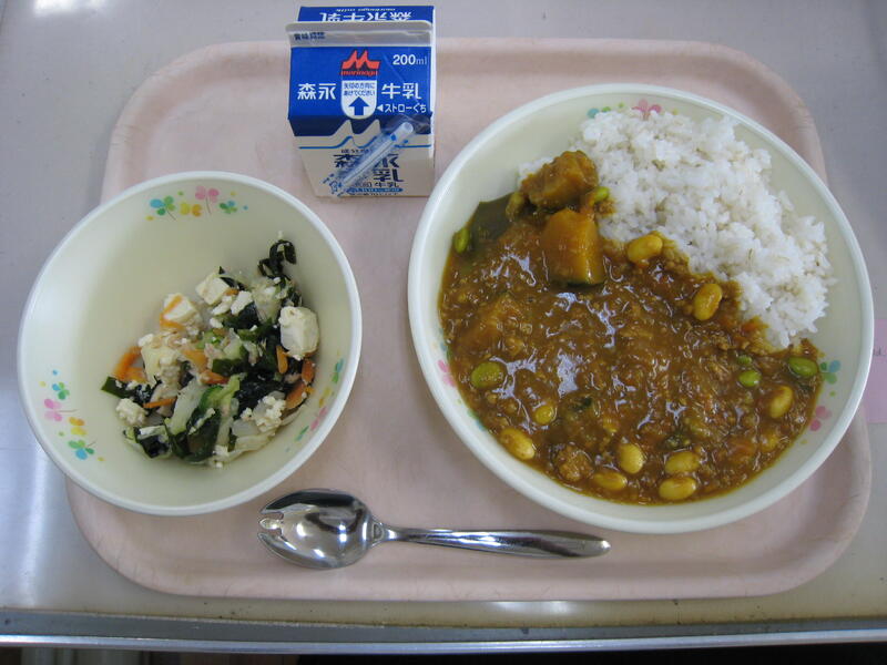 今日の献立は、牛乳、夏野菜のドライカレーライス、とうふサラダです。まだまだ暑い日が続きます。栄養をとって、暑い夏を乗り切りましょう!
