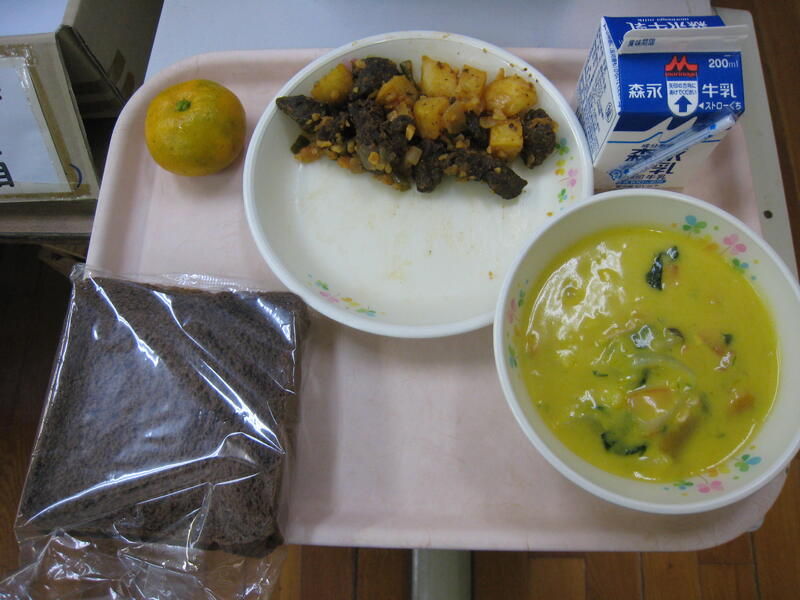今日の給食の献立は、【牛乳・ココアパン・レバーのオーロラあえ・クリームスープ・みかん】です。レバーのオーロラあえはレバーが苦手な子もおいしく食べれるように調理してあり、ありがたいです。