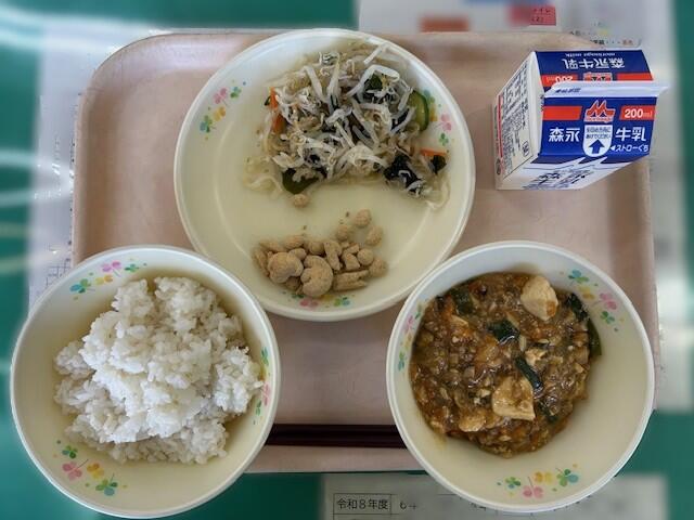 今日の献立は、【牛乳、麦ご飯、カボチャのそぼろ煮、ちぐさ和え、ミニトマト、カツオのふりかけ】です。今日の注目メニューは「カボチャのそぼろ煮」です。ゴロゴロとした大きいカボチャがたくさん入っていました。今日使用されていたカボチャは、甲佐町の宮内地区で収穫されたものだそうです。とても甘い味わいで、美味しくいただきました。職員室内でも大好評の様子で、またいつか食べてみたいなと思える美味しさでした。今日も美味しい給食に感謝・感謝です。