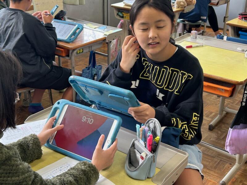 1時間目、千葉県の船橋市の夏見台小学校の6年生とオンライン交流を行いました。「You can see~」等の表現を使い、熊本の魅力を紹介しました。