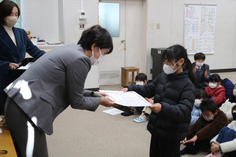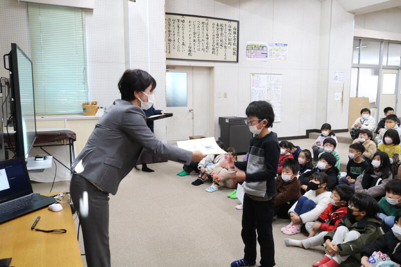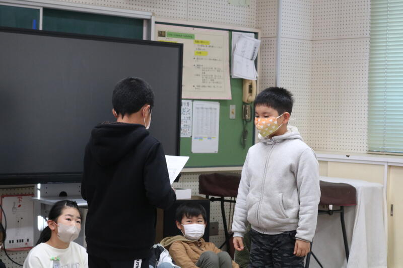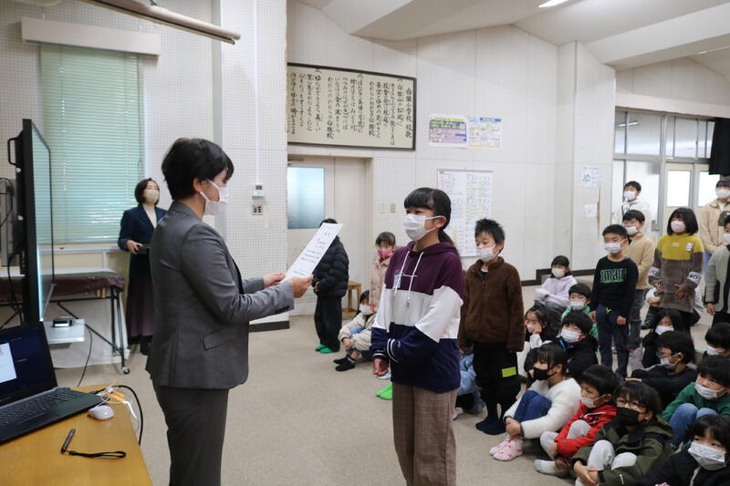 終業式では(感染対策のため、マスクを着用して音楽室で行いました)、2学期の終わりにふさわしい、話を集中して聞いたり、号令がなくても礼を合わせたりする子供達の姿がありました。校長の話では、2学期の始業式で伝えた2つの頑張ってほしいこと「気付き・考え・行動する」「友達にやさしくする」について、写真や児童アンケートをもとに振り返りを行いました。2学期は、行事をとおして、子供達が主体的に考え進んで行動する姿が多くあり、それが力となって、どの子も大きく成長してくれました。