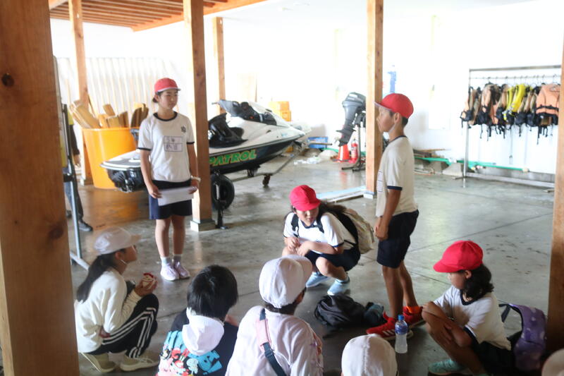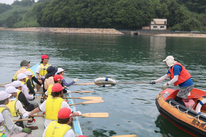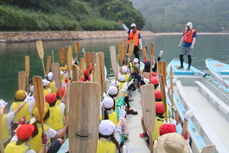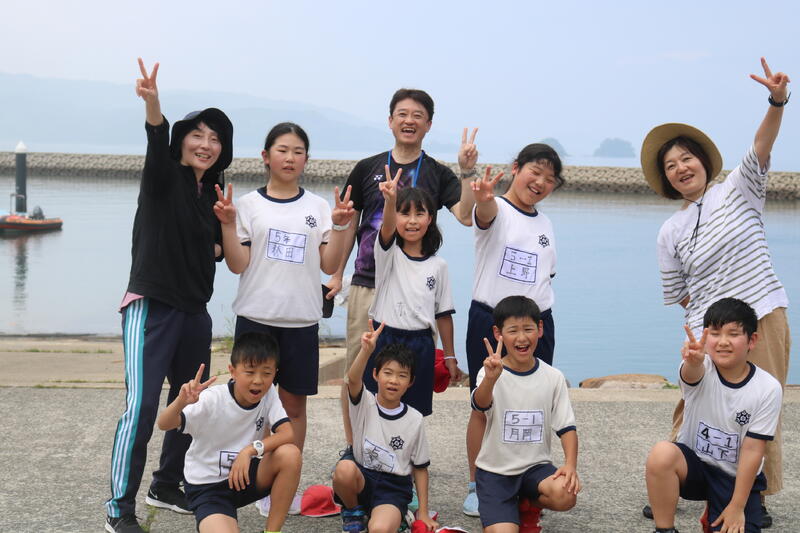 ペーロン舟は、右舷に白旗小、左舷に府本小の児童が乗り、別の学校と競争しました。「浮き輪とりレース」と「直線レース」の2種類をやって、両方とも勝利。子どもたちも人数では少なかったけど、団結することで勝つことができることを学びました。