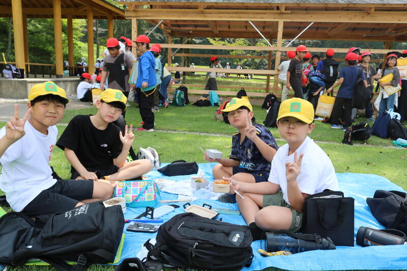 朝は、朝食会場で府本小の友だちが「こっち、こっち」と手を挙げて白旗小の子を迎え入れてくれました。交互に座り、仲良くおしゃべりしながら食事を楽しんでいました。
