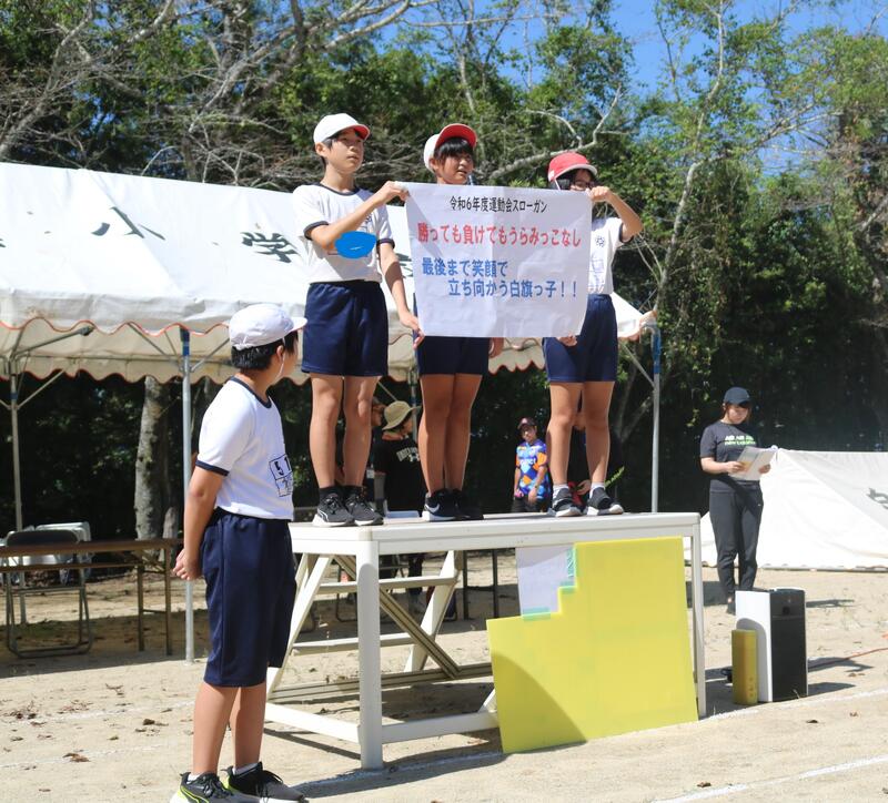 はじめに、児童会執行部から、代表委員会で話し合って決まった運動会のスローガン発表がありました。