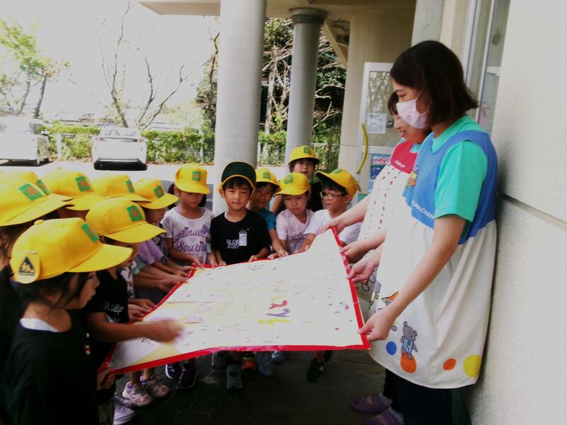 先日、1年生一人一人が運動会の絵を描き、それを大きな広用紙に貼り、大きな運動会のポスターを作ってくれました。その大きなポスターを担任の宮田先生と1年生全員で緑川保育所に持って行ってくれました。保育所の先生も園児さんもとても喜んだことと思います。この大きなポスターは、甲佐中学校にも持って行きます。