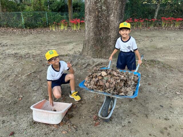 そして、集まったたくさんの落ち葉をみんなで捨てに行ってくれました。昨年から大きく成長したなと改めて思った時間でした。子供達のやる気と笑顔に、たくさんの元気をもらった朝のスタートとなりました。