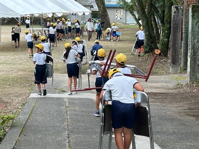 また、閉会式後には、PTA会長をはじめ、多くの保護者の皆様に片付けを行っていただきました。保護者の皆様の主体的なご協力により、テントや入退場門、机や椅子の片付けを行っていただき本当にありがとうございました。