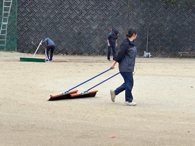 しかし、正午頃には、本日の午後~明日終日にかけて、降水確率も0%の予報に変わり、運動場も少しずつかわいてきました。(今日はずっと、天気予報とにらめっこでした)