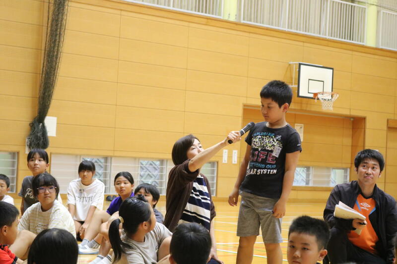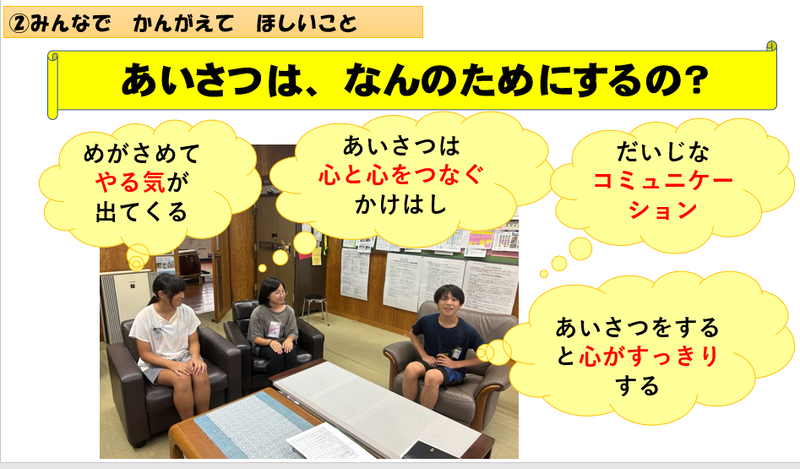 子供達には、「あいさつは何のためにするのか」を考えてもらいました。みんな一生懸命考えてくれています。