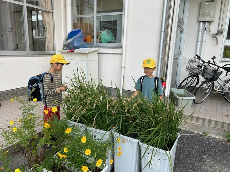 今朝、児童玄関前にいると、児童玄関脇の畑で、4年生と1年生がバケツ稲を見て「ずいぶん大きくなったね。」「みが黄色くなってきたね。」と話していました。2人の会話を聞いて、朝から、ほのぼのとした気持ちになりました。