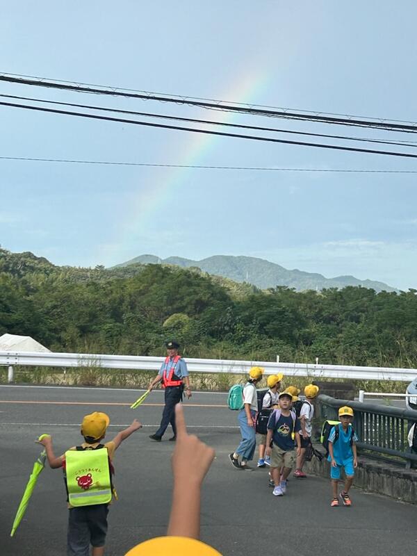 なんと、そこには、きれいな「にじ」が、かかっていました。登校してきた子どもも、「あー、にじだー。」「きれいだな。」「青色と、黄色と、赤色と・・・・。」「昨日も、にじが出てたよね。」と口々に話しています。