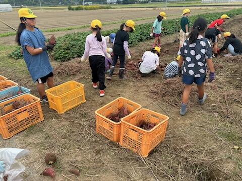 今日は、3・4年生が楽しみにしていた「いもほり」がありました。毎年(長年)、糸田の緒方さんの畑で、芋の苗植えと芋掘りをさせていただいています。