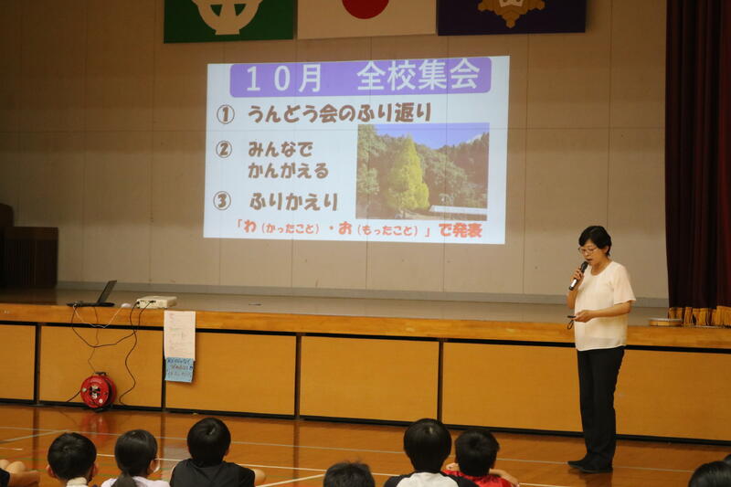 発表の中で、図書委員は、「おみくじビンゴ」や、「先生からのおすすめの本の紹介」「29日の先生方の読み聞かせ」「26日からの親子読書」など、読書旬間に企画したイベントについて伝えました。